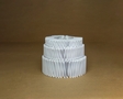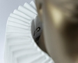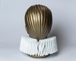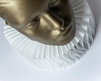 White Elizabethan ruff made of transparent, delicate ribbon on a rigid base that holds its shape. The fastener is adjusted with ties and eyelets. Every fold is meticulously hand-sewn, with some details crafted using a sewing machine.