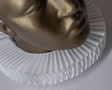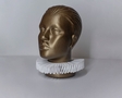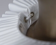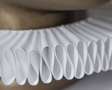 White Elizabethan ruff made of transparent, delicate ribbon on a rigid base that holds its shape. The fastener is adjusted with ties and eyelets. Every fold is meticulously hand-sewn, with some details crafted using a sewing machine.